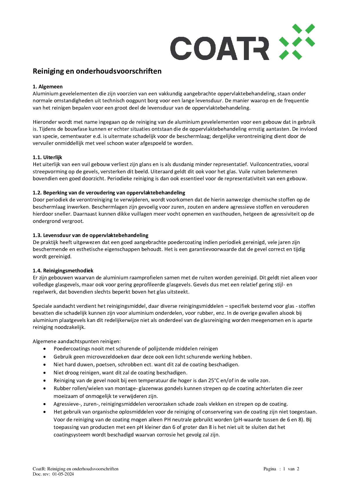 Via de volgende linkt kunt u de Aanbeveling reiniging CoatR datasheet downloaden: